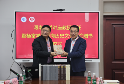 mg4355vip检测中心院长祁琛云教授向敦煌研究院人文研究部部长杨富学教授递交聘任证书,并代表mg4355vip检测中心接受杨富学教授赠书。