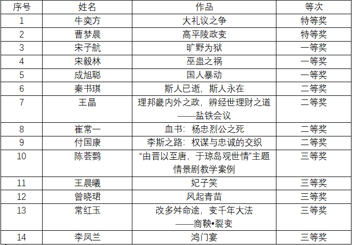 本次大赛反响热烈,五湖四海的青年学子、历史教师以及社会人士以历史上的主要政治事件、重大战例、重要思想争鸣为素材,编写了精彩的历史情景剧剧本。这些作品不仅展现了参赛者对历史教育的深刻理解与思考,更体现了科技赋能教育的无限可能。经过评委会审议,最终评选出特等奖2名、一等奖3名、二等奖4名、三等奖5名(具体名单详见下表)。